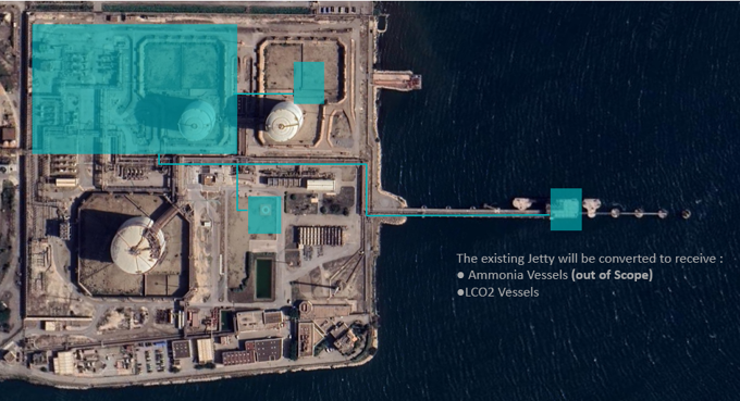 • Un système de transfert de CO₂ liquéfié jusqu’au poste de chargement et une installation de chargement pour navire transporteur de LCO₂.